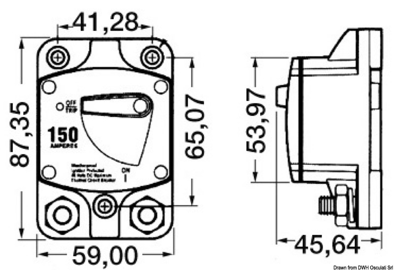 Interruttore magnetotermico stagno di protezione per verricello ed elica di prua, con terminali elettrici da 5/16″